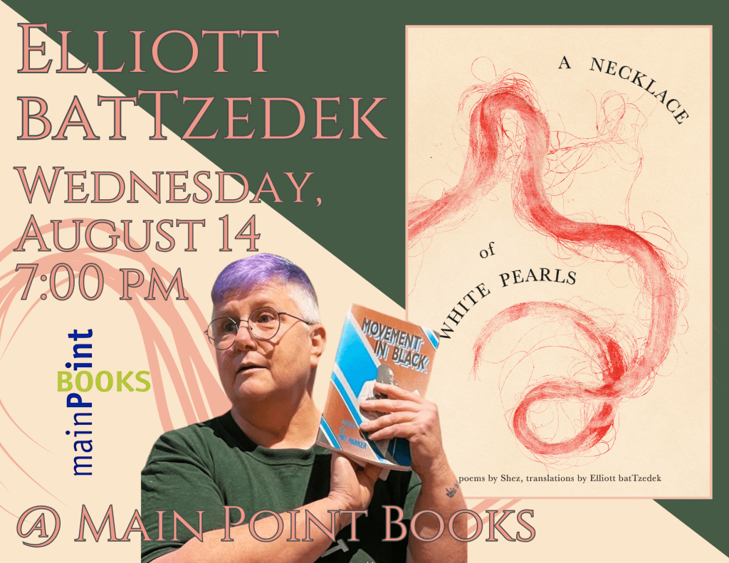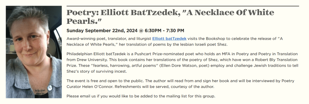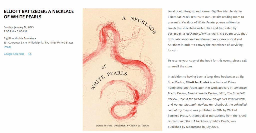 Elliott batTzedek is a Pushcart Prize-nominated poet/translator. Her work appears in: American Poetry Review, Massachusetts Review, Lilith, The Broadkill Review, Hole in the Head Review, Naugatuck River Review, and Hunger Mountain Review. Her chapbook the enkindled coal of my tongue was published in 2017 by Wicked Banshee Press. A chapbook of translations from the Israeli lesbian poet Shez, A Necklace of White Pearls, was published by Moonstone in July 2024.